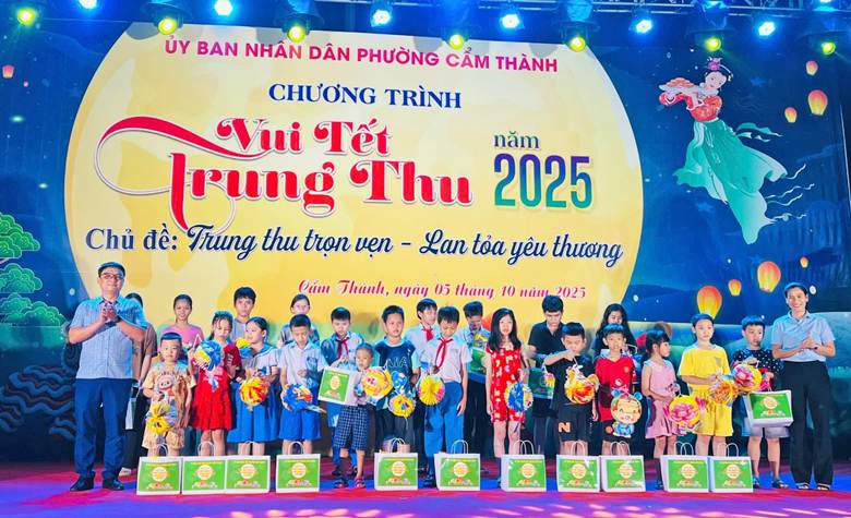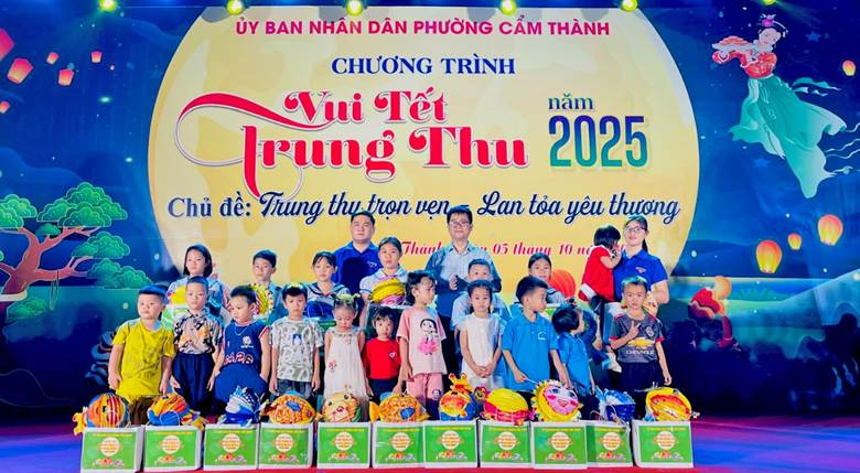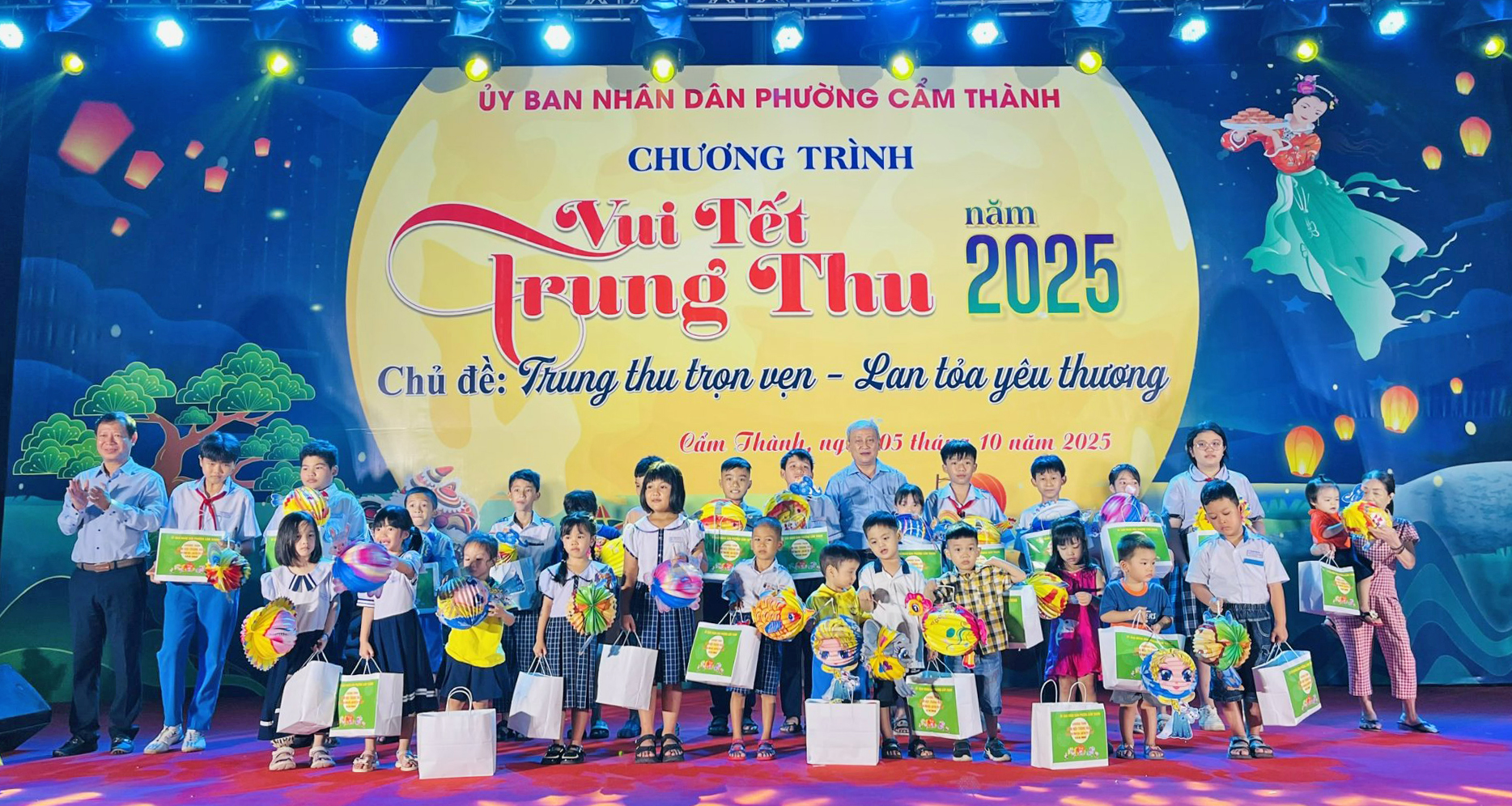 Điểm nhấn của chương trình là UBND phường Cẩm Thành phối hợp cùng Công ty Bibica và các đơn vị tài trợ trao 114 suất quà cho các em thiếu nhi có hoàn cảnh khó khăn, thể hiện tinh thần sẻ chia, lan tỏa yêu thương, giúp mọi trẻ em đều có một mùa trăng trọn vẹn niềm vui.