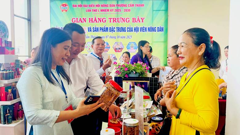 Không gian trưng bày sản phẩm OCOP và sản phẩm đặc trưng của hội viên nông dân phường Cẩm Thành tại Đại hội