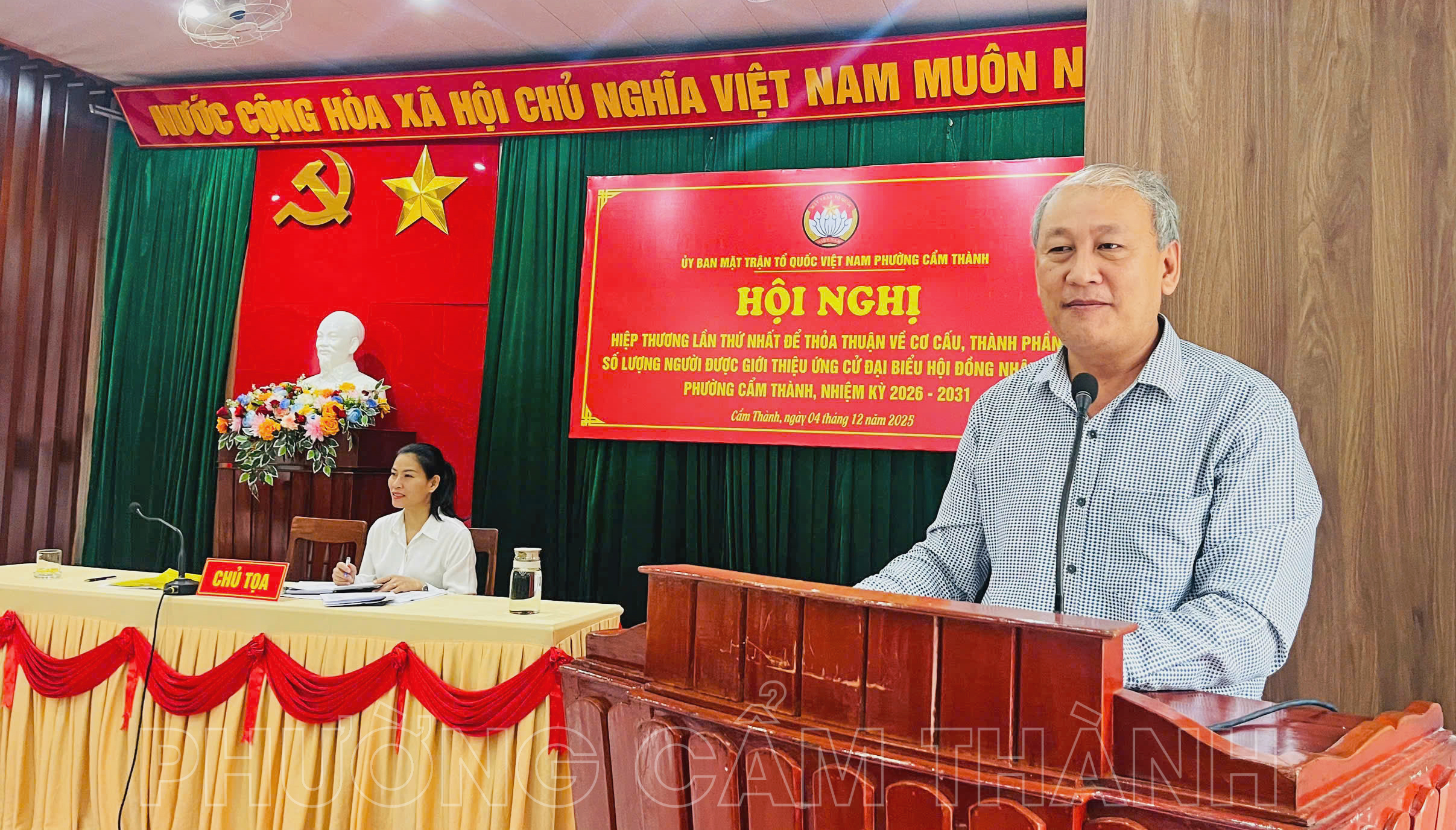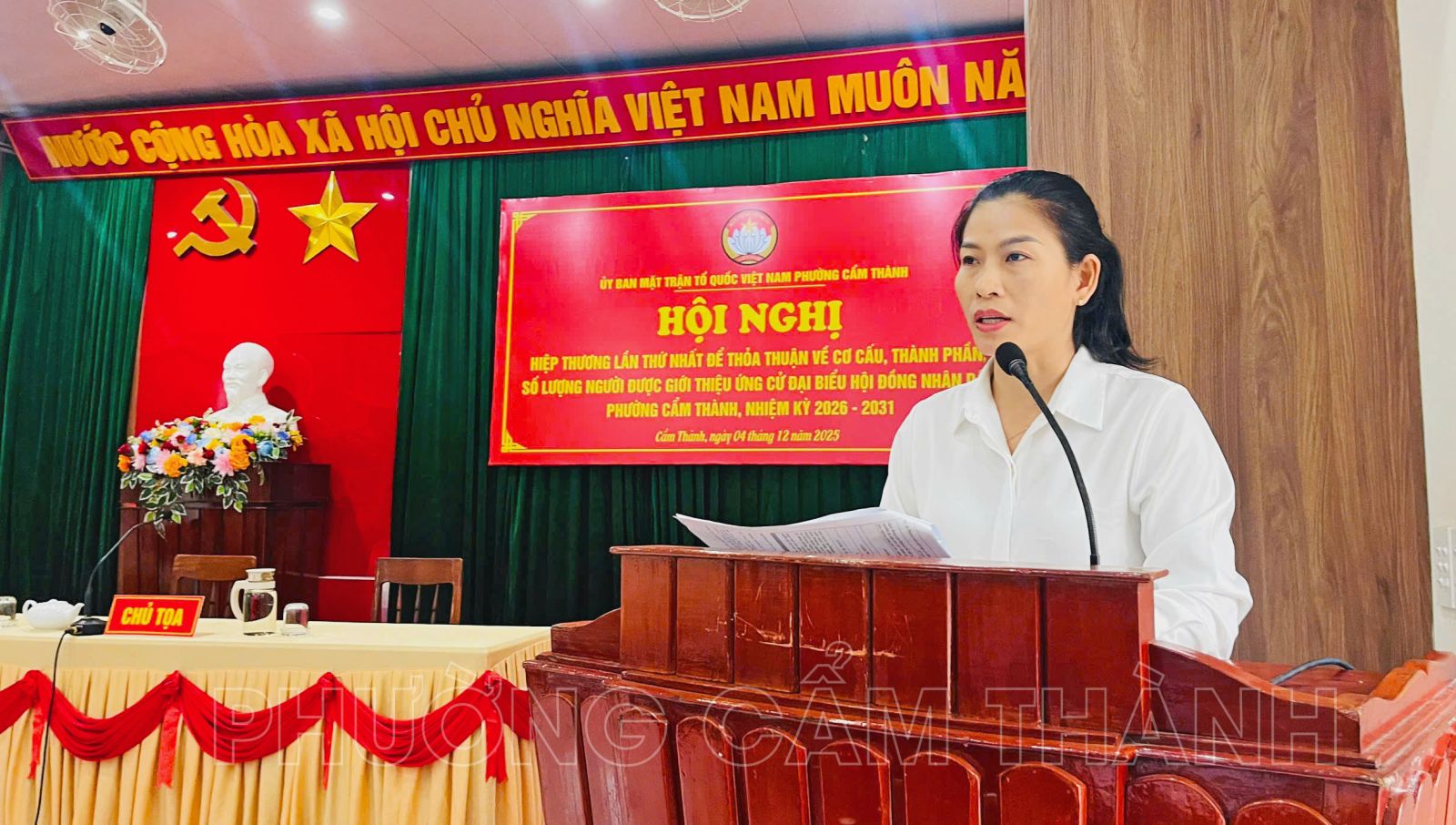Sáng 4/12, Ban Thường trực Ủy ban MTTQ Việt Nam phường Cẩm Thành (Quảng Ngãi) tổ chức Hội nghị Hiệp thương lần thứ nhất, nhằm thỏa thuận về cơ cấu, thành phần và số lượng người được giới thiệu ứng cử đại biểu HĐND phường nhiệm kỳ 2026 – 2031.